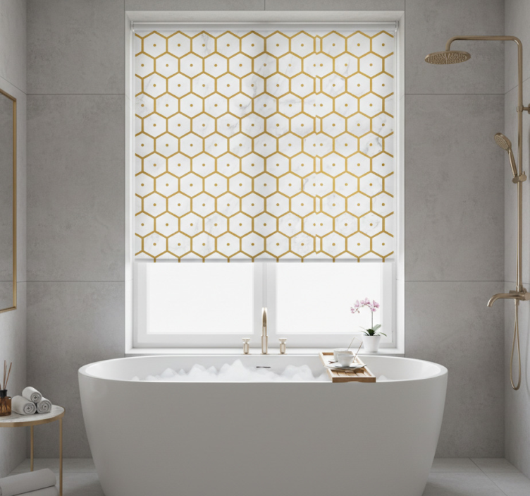 在我们的在线商店,您能找到最优质的卫生间盲道,采用六角形金色大理石图案,确保为您提供独特而奢华的选择。我们的产品100%可定制测量,您可以根据自己的需要选择适合的尺寸和纹理,确保完美契合您的窗户。