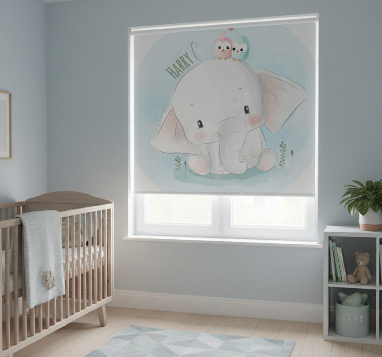 一幅迷人的插图描绘了一只可爱的象,脸颊红润,安详地坐着。两只小鸟,一只粉色的,另一只蓝色的,栖息在它的头上,散发出友谊的气息。细腻的绿色植物与宁静的天蓝色背景相辅相成,增强了这种顽皮而温柔的主题。