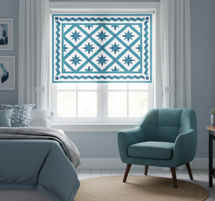 一个引人注目的几何图案呈现交替的星形和菱形图案,配以锐利的边框。设计展示了深青色与浅色调的和谐结合,创造出令人耳目一新的对比,吸引眼球。生动的色彩点缀其间,增添了视觉趣味和优雅感。