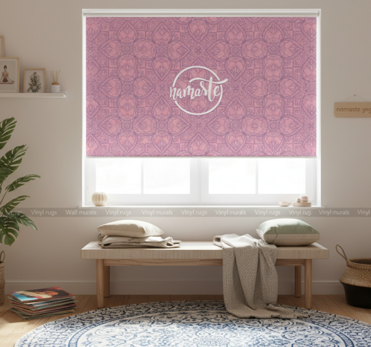 一个复杂的设计,呈现出柔和粉色调的精致图案。中央的主题被花卉元素和几何形状环绕,传达出宁静与和谐。中央位置是优雅的草书字体写的'namaste',象征着尊重和正念。