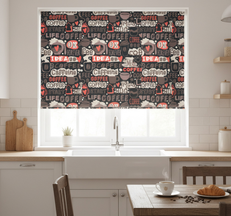 在我们的商店购买kitchen roller blind,您将获得优质的客户服务和100%可定制的测量选项。厨房盲道与咖啡字母图案相结合,无论是设计还是功能,都将满足您的需求,让您体验到无与伦比的购物乐趣!