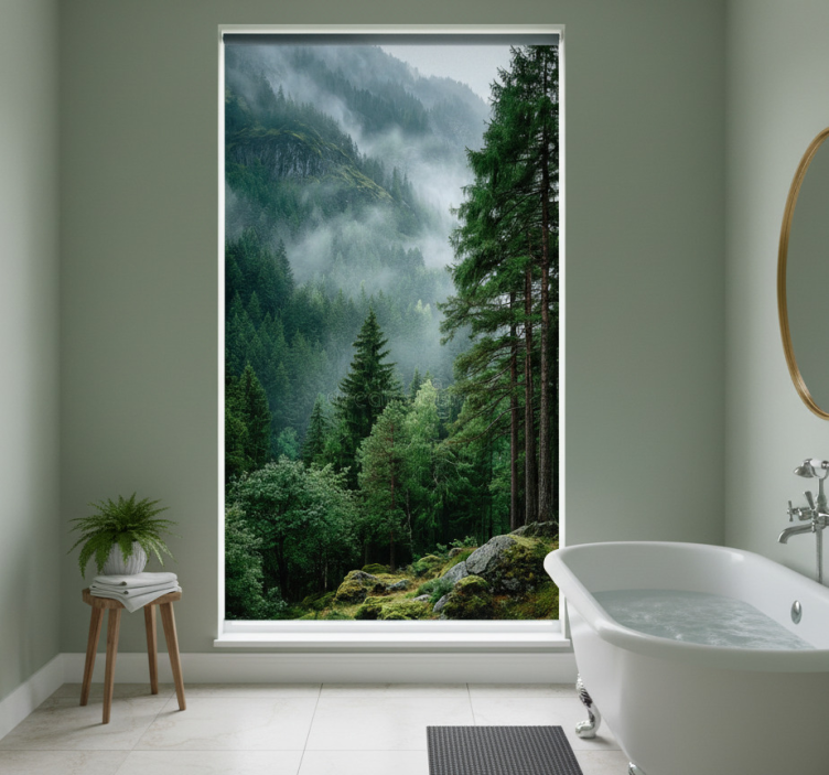 一幅宁静的风景,耸立的树木和郁郁葱葱的绿意交织在一起,远处的山脉笼罩在薄雾之中。不同深浅的绿色和植物的纹理营造出一种平和的氛围。覆盖着苔藓的岩石增添了自然之美,唤起与自然的宁静连接感。