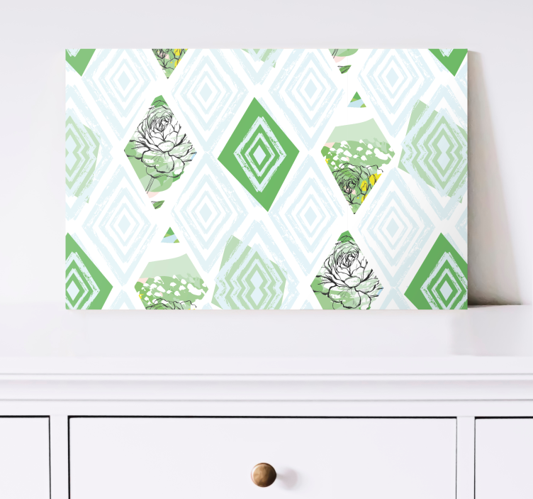 參考:: Q7061该设计采用几何图案,由重叠的菱形形状和多汁植物插图组成。布局中穿插了绿色元素与精致的花卉细节,突显了自然之美与现代风格的结合。