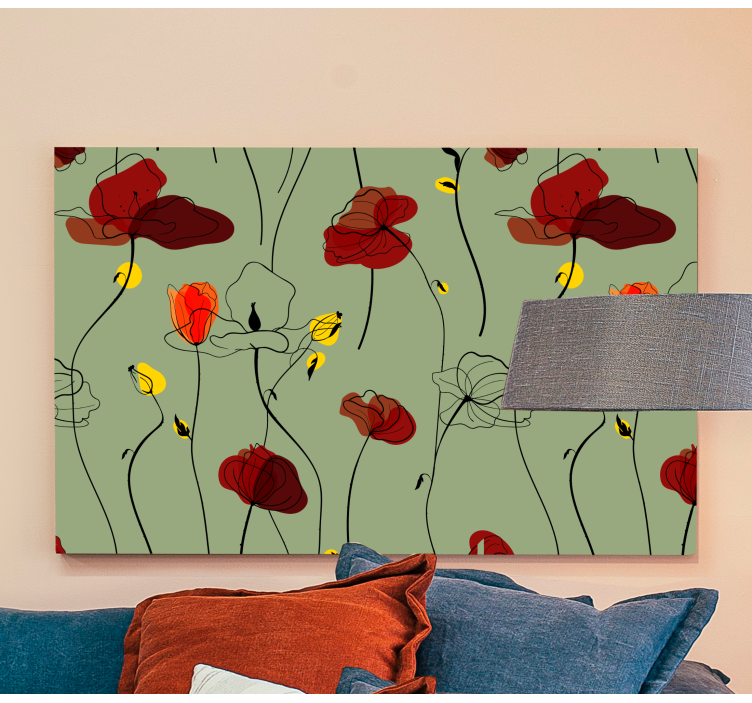 这个复杂的设计展示了红色、黄色和白色的罂粟花在柔和的绿色背景下精致的排列。流畅的线条和有机的形状创造出一种动态的构图,唤起了运动和生命的感觉,非常适合为室内带来新鲜的自然气息。