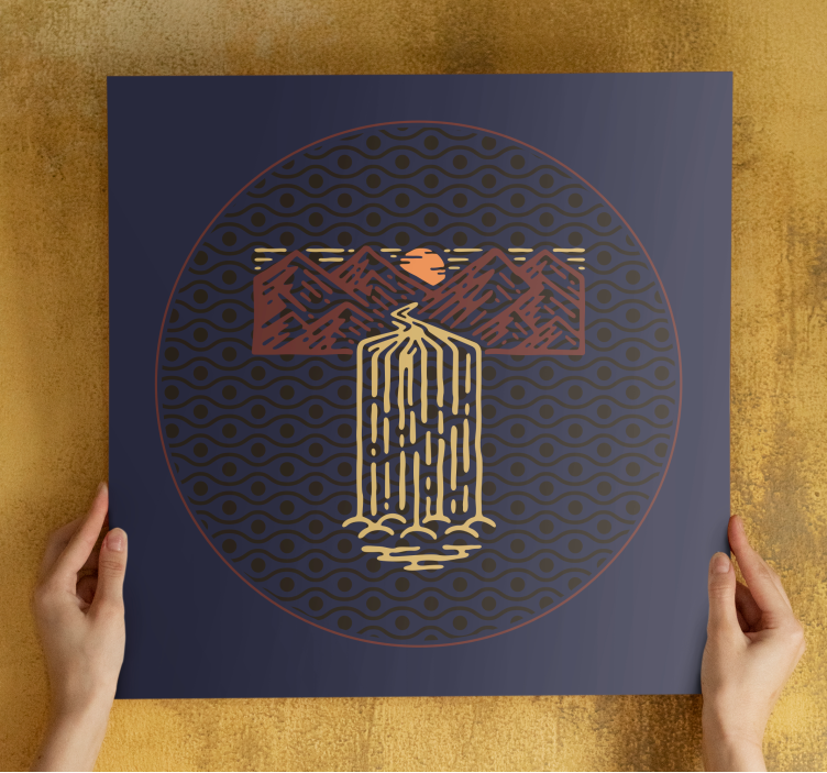 參考:: Q7828一幅宁静的作品,描绘了一道瀑布在风格化的山峰间倾泻而下,夕阳西下。圆形的设计增添了和谐感,而复杂的线条则唤起了与自然世界的宁静与连接感。