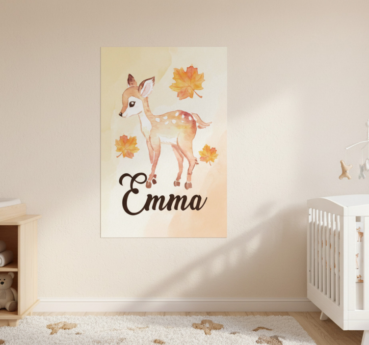 这幅迷人的插图描绘了一只身上带有细腻斑点的小鹿,周围环绕着鲜艳的橙色树叶。作品散发出温暖和玩乐的气息,以优雅流畅的字体突显了名字 'Emma'。非常适合婴儿房,为任何儿童房间的装饰增添了一丝奇幻的色彩。