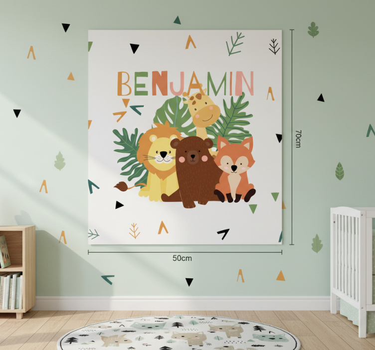这幅图像展示了一种迷人的墙面艺术设计,描绘了色彩缤纷的卡通动物,包括狮子、熊、狐狸和长颈鹿,周围环绕着郁郁葱葱的绿叶。名字 'BENJAMIN' 在白色背景上格外突出,并辅以俏皮的几何图形。这幅令人愉悦的艺术作品非常适合儿童房间的装饰。