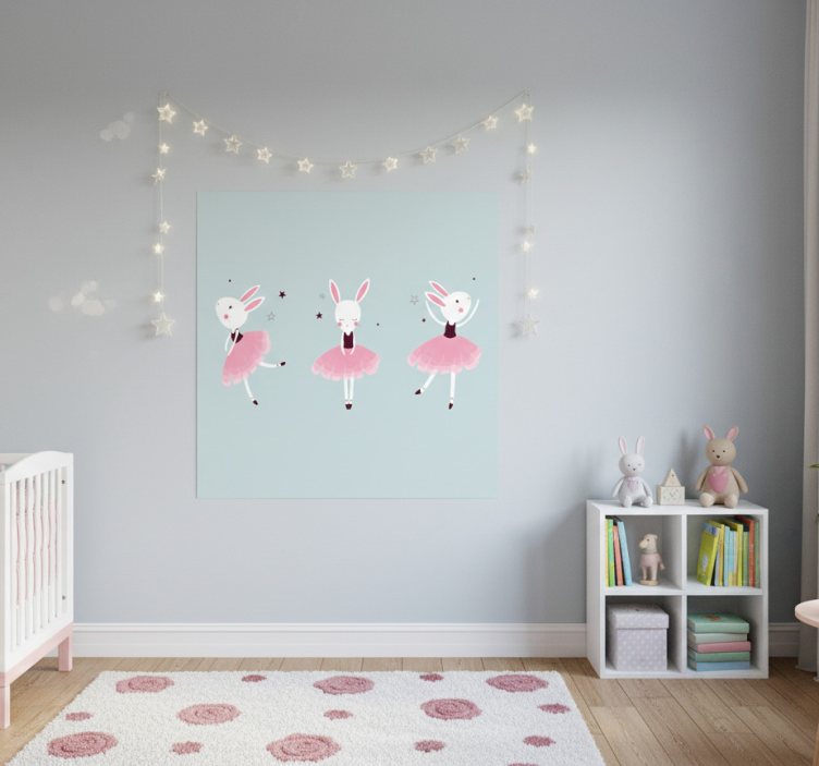 这幅迷人的插图展示了三只穿着粉色芭蕾舞裙的奇幻兔子,优雅地摆姿势,背景是一片舒缓的蓝色。它们顽皮的表情和芭蕾舞姿势增添了愉悦的气息,捕捉了童年快乐和创造力的本质。柔和的装饰元素增强了迷人的氛围,使其成为婴儿房的完美选择。