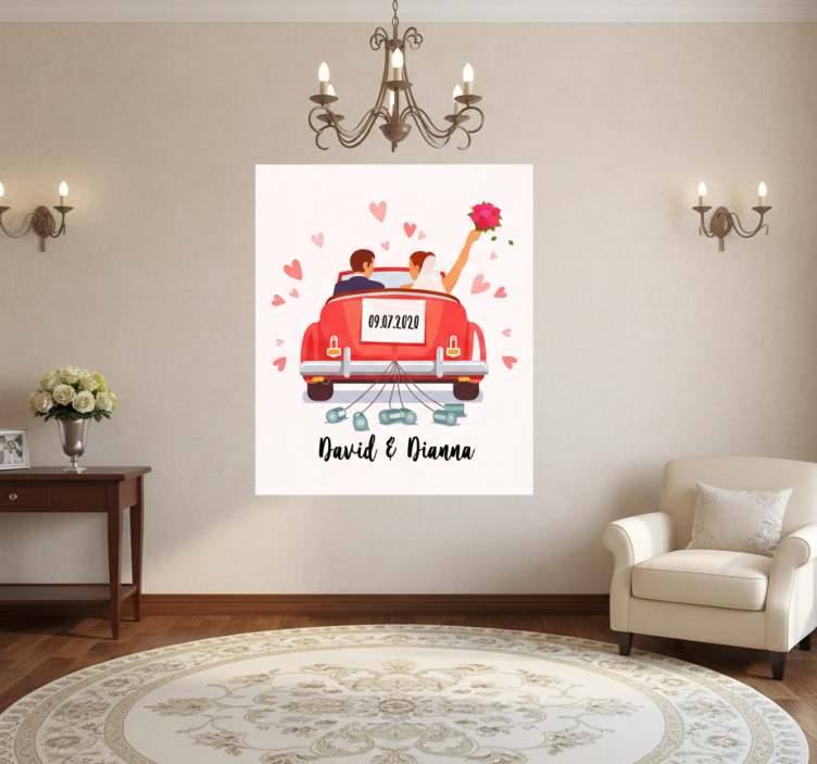这幅迷人的插图描绘了一对新人在一辆鲜艳的红色汽车中欢庆他们的婚礼。新娘手捧花束,新郎面带微笑,周围漂浮着粉色的心形图案。日期09.07.2020显著地呈现出来,突显了这个特殊的时刻,营造出一种爱与幸福的氛围。