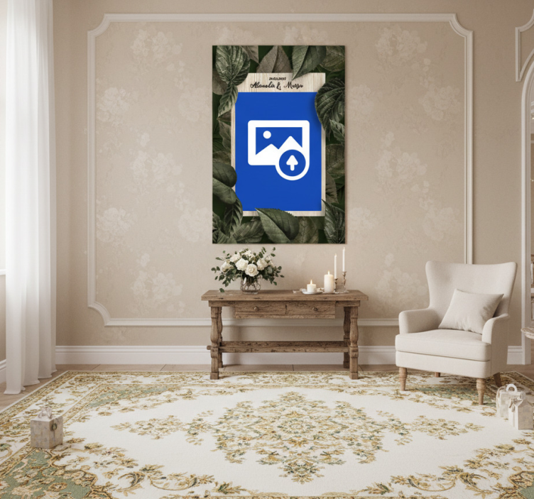 这幅图展示了一个时尚、现代的室内环境,中央是一张装饰着鲜花和蜡烛的木桌。一把舒适的椅子邀请人们在这个精心设计的空间中放松。上方,背景为蓝色的艺术作品,配有一个象征性的图像上传图标,周围被郁郁葱葱的绿叶环绕,增强了生动的氛围。