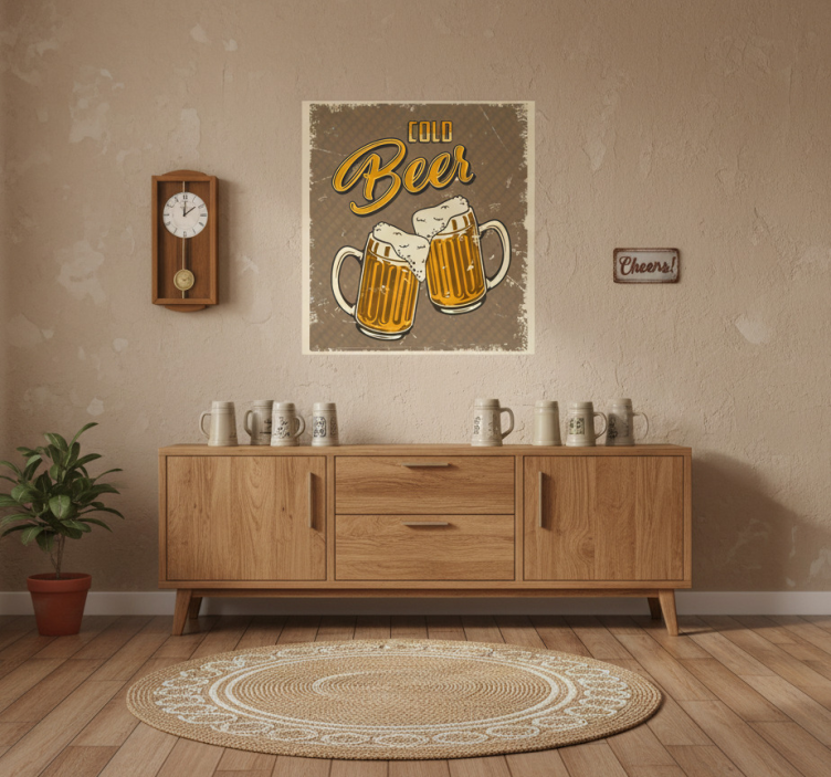 这幅诱人的图像展示了两只冰凉的啤酒杯碰撞在一起,散发出友好的氛围。时尚的排版在上方显著地宣告着 'Cold Beer',增强了整体愉快的氛围。温暖的土色调和乡村风格的设计为聚会或休闲庆祝活动营造了完美的氛围。