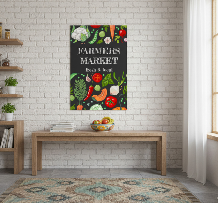 这张图片展示了一个充满活力的农贸市场海报,特色鲜艳的蔬菜和香草。醒目的文字强调了 'FARMERS MARKET' 和 'fresh & local'。背景较暗,突显了番茄、绿叶蔬菜、胡萝卜等丰富的色调,为健康生活营造了一个诱人的氛围。