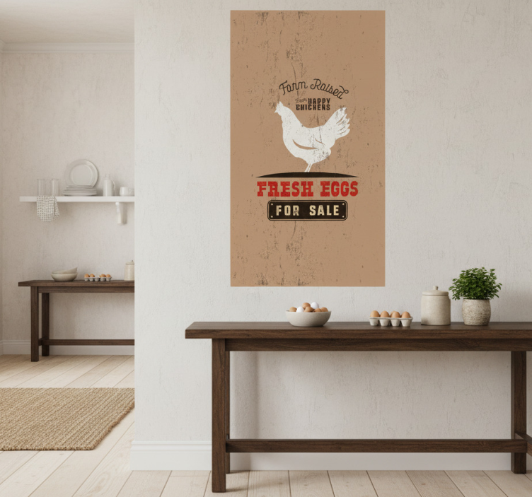 这幅乡村风格的图像展示了一个迷人的墙面标志,宣传来自快乐、农场饲养的鸡的新鲜鸡蛋。自然的色调与复古设计相得益彰,强调了质量和天然成分。标志上大胆的字体吸引眼球,非常适合专注于农场新鲜产品的温馨厨房或餐厅空间。