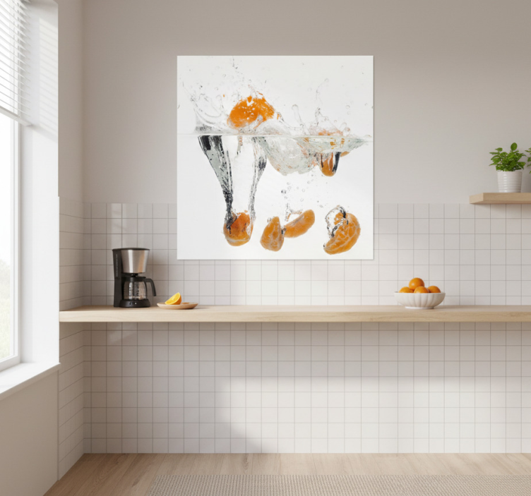 在一个极简主义的厨房环境中,一幅令人惊叹的艺术作品描绘了鲜艳的橙子溅入清澈的水中。气泡在果实周围舞动,营造出清新的视觉效果。一台咖啡机静静地矗立在旁边,而一个装满橙子的碗则放在架子上,增强了空间的温馨氛围。