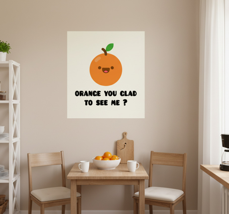 一幅生动的插图展示了一个面带微笑的快乐橙子,旁边配有俏皮的短语 'Orange you glad to see me?'。这个富有想象力的设计为任何空间增添了趣味,非常适合厨房或餐厅。友好的艺术作品既引人入胜又轻松愉快。