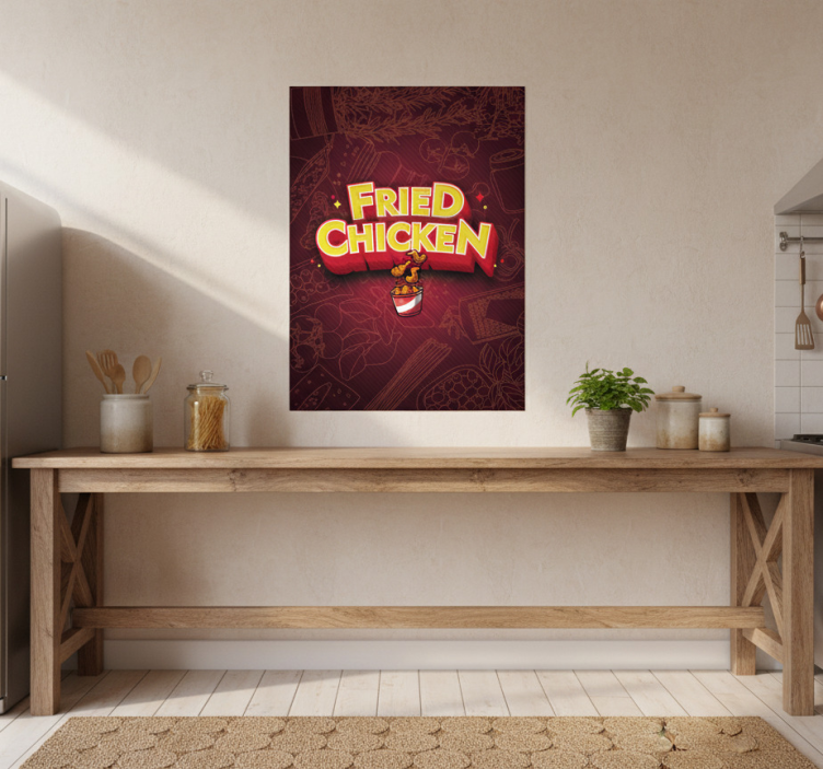 这幅生动的图像以大胆的排版风格生动呈现了'Fried Chicken'的形象。背景充满温暖的色调,增强了视觉吸引力。伴随的食品元素图形微妙地补充了主要主题,营造出一种邀请的氛围,非常适合美食爱好者。