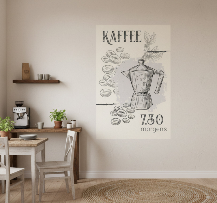 这幅艺术作品描绘了一只经典的咖啡壶和散落的咖啡豆,体现了迷人的咖啡馆氛围。设计主要以黑白色调为主,辅以微妙的灰色,包含了单词 'Kaffee' 和时间参考,暗示着围绕咖啡享受的愉悦早晨仪式。