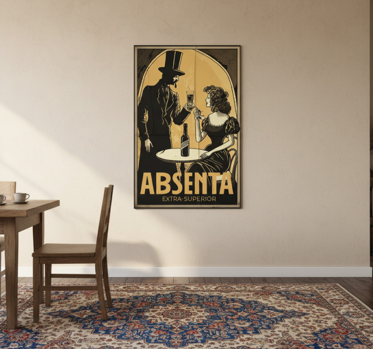 这幅图像展示了一张复古风格的海报,突出了 'Absenta Extra-Superior'。一对穿着优雅的情侣在桌旁交谈,绅士正向女士递饮品。艺术设计强调了经典的优雅,使其成为任何房间装饰的惊艳焦点。