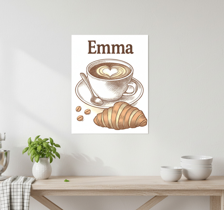 这幅迷人的插图展现了一只精美制作的咖啡杯,顶部装饰着心形奶泡设计,旁边配有一只美味的可颂。艺术作品上方个性化地写着名字 'Emma',营造出温暖而宜人的氛围。附近散落着咖啡豆,增强了舒适的氛围。