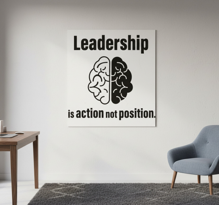 这幅图展示了一句引人深思的名言,强调了通过双脑图形展现的领导本质。对比的黑白色彩象征着创造力和逻辑。这个信息提倡行动而非仅仅追求头衔,使其成为激励空间或专业环境中的强大视觉元素。