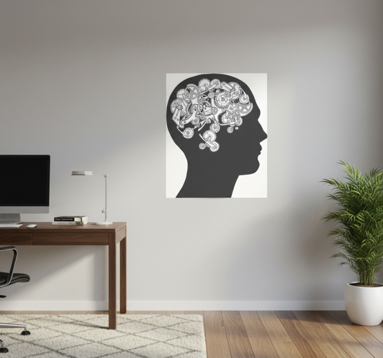 这件艺术作品展示了一个人头的轮廓,内部填满了复杂的机械齿轮和齿条,象征着思维和创造力的复杂性。对比鲜明的色调突显了精致的设计,使其成为一件引人注目的视觉作品,适合现代装饰。非常适合激发创新和想象力。