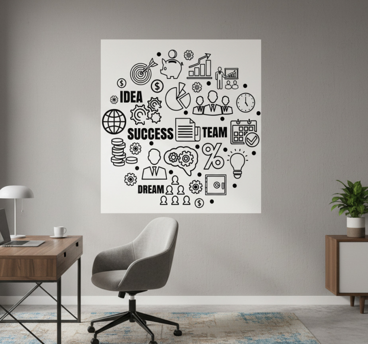 这幅图像展示了一幅鼓舞人心的墙面壁画,体现了与商业成功、团队合作和创新理念相关的概念。主要元素包括图表、灯泡以及代表金融的符号。现代的工作空间散发着专业气息,配有时尚的桌子和符合人体工程学的椅子,点缀着一些绿植。整体上,这里营造了一个富有创意和高效的氛围。