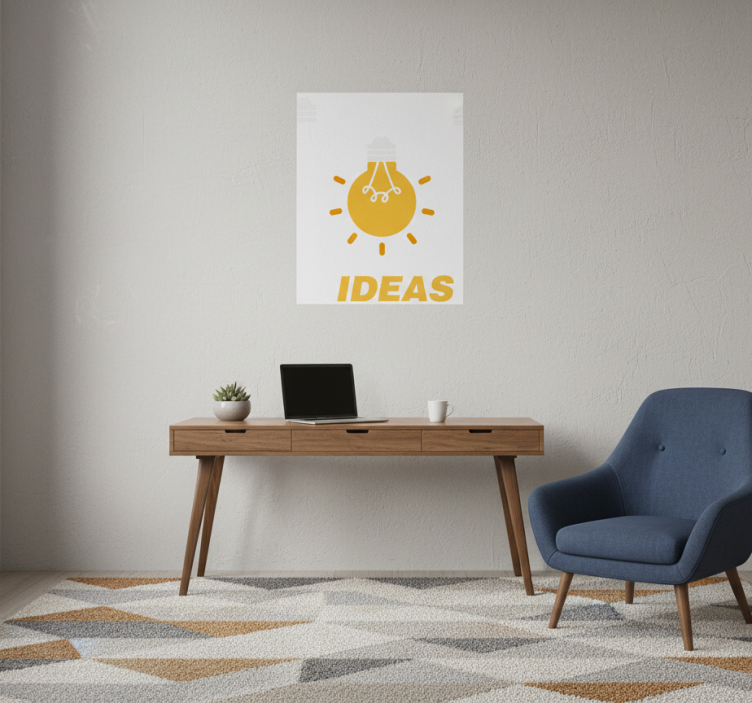 这幅图展示了一个现代化的工作空间,配有时尚的木质桌子,上面放着一台笔记本电脑、一杯咖啡和一株小植物。一把蓝色椅子提供了舒适感,而墙上挂着一幅展示了生动灯泡和单词 'IDEAS' 的励志海报,增强了房间内的创造力。