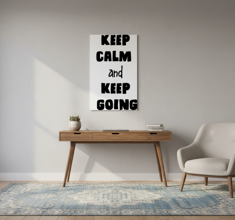 这幅图展示了一个时尚的简约工作空间,木制书桌上摆放着现代植物和一叠书籍。墙上挂着一张激励海报,上面写着 'KEEP CALM and KEEP GOING',为人们提供灵感。一把舒适的椅子与宁静的氛围相得益彰,而一块图案地毯则为空间增添了质感。