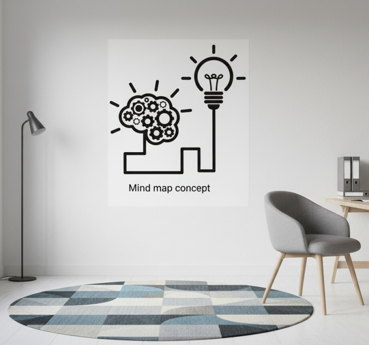 这幅图展示了一个极简风格的工作空间,里面有一盏灯、一把扶手椅和一个圆形地毯。一幅墙面壁画呈现了一个创意思维导图的概念,描绘了一个与灯泡和齿轮相连的脑部。这种设计强调了创新、智慧和创造力,非常适合头脑风暴或学习活动。