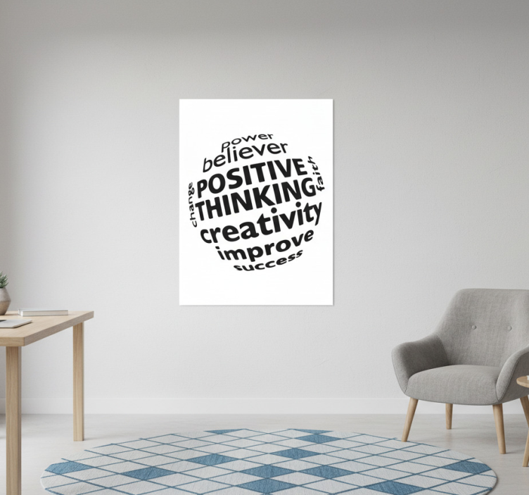 这幅图像展示了一件鼓舞人心的墙面艺术作品,包含了一系列激励人心的词汇,如 'believer'、'positive thinking' 和 'creativity'。设计强调个人成长和成功,通过视觉上引人注目的排列,完美地提升任何空间,并鼓励积极的心态。