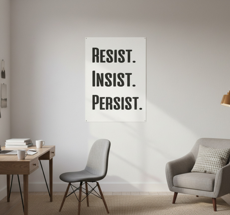 这张图片展示了一个时尚的室内环境,突出了一个激励人心的墙面艺术作品,上面用粗体字写着'Resist. Insist. Persist.'。柔和的色调增强了宁静的氛围,现代家具包括一把灰色椅子和一张木桌。整体设计传达了灵感和决心。