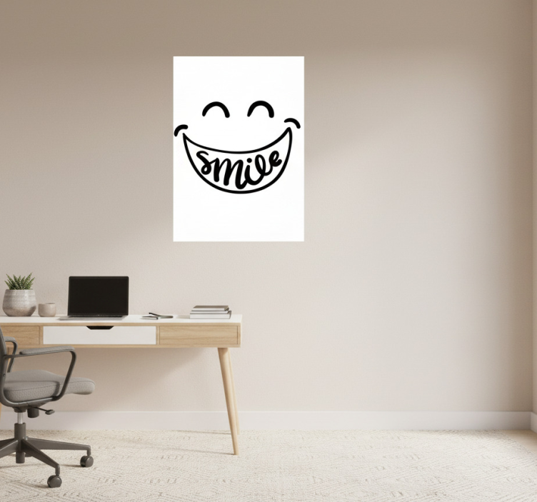 这幅图描绘了一个极简风格的工作空间,墙上挂着一幅生动的艺术作品,画中有一个愉快的笑脸和显眼的词汇“smile”。背景与整体美感相得益彰,而一张时尚的桌子和现代的椅子则增添了温馨的氛围,使这个空间成为激发灵感和传播积极情绪的完美场所。