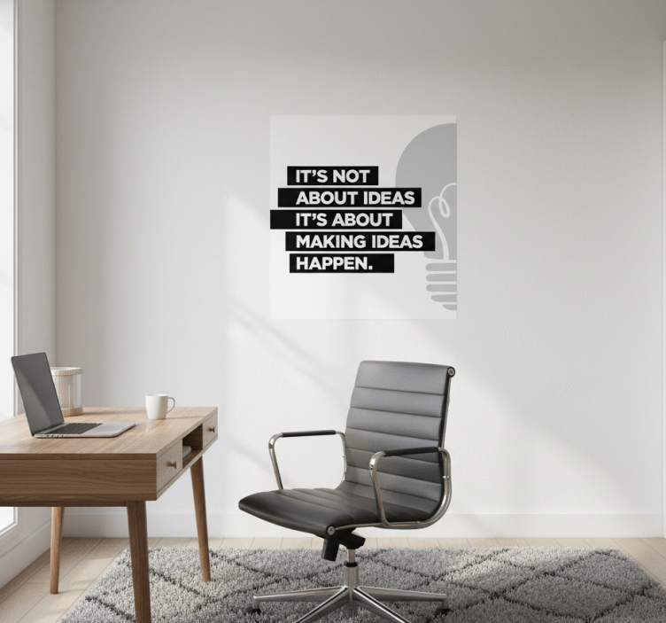 一个时尚的家庭办公室布置有一把优雅的黑色椅子,旁边是一个木制书桌。桌子上放着一台笔记本电脑,旁边还有一个咖啡杯。墙上挂着一张鼓舞人心的海报,强调行动的重要性,指出这不仅仅是关于想法,而是它们的实现。现代的美学促进了创造力。