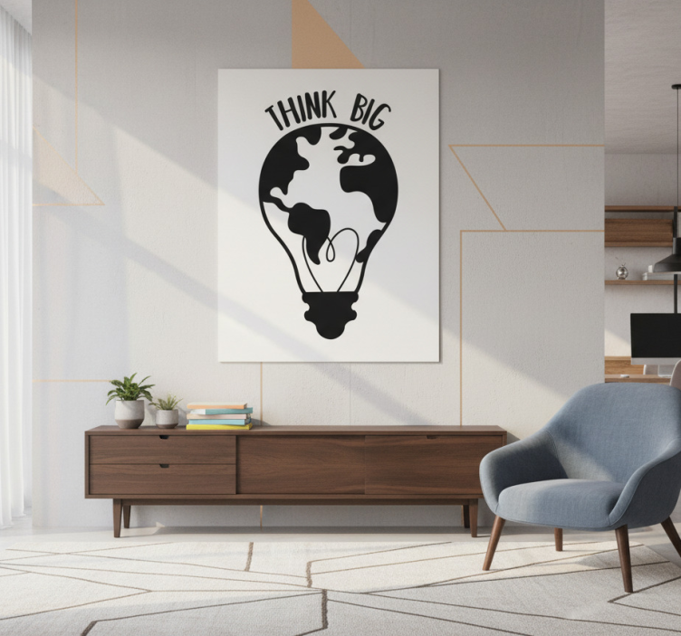 这幅图展示了一个现代室内环境,呈现出一幅生动的艺术作品,巧妙地将灯泡设计与世界地图结合在一起。'THINK BIG' 这个短语显眼地位于顶部。与艺术作品相辅相成的是一款时尚的木质控制台,上面摆放着装饰植物和色彩斑斓的书籍,增强了房间的现代美感。