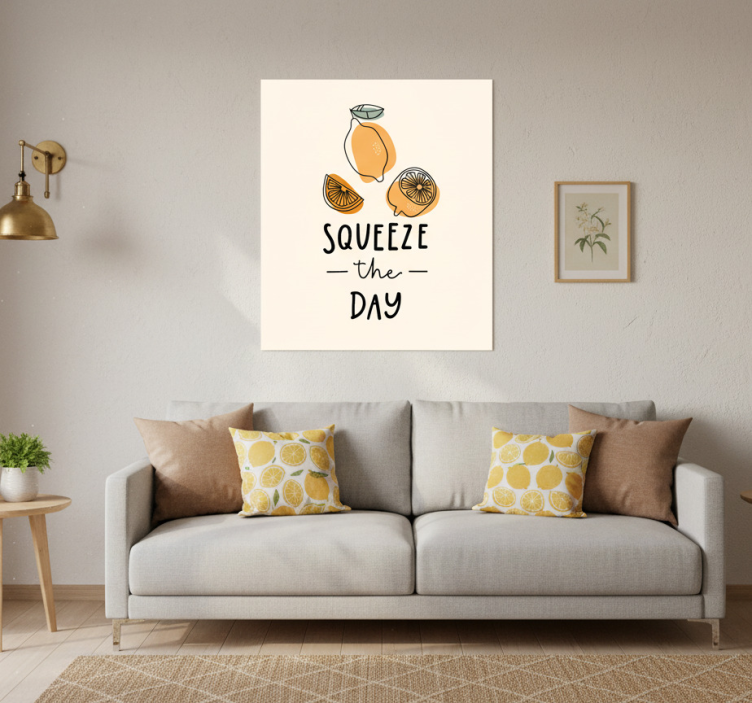 这幅图展示了一个时尚的室内场景,舒适的沙发上装饰着鲜艳的柠檬主题靠垫。一幅俏皮的墙面艺术作品上写着'Squeeze the Day',并配有生动的柠檬和柑橘插图。简约的装饰元素,包括一盆植物和框架艺术品,增强了这个温馨的氛围。