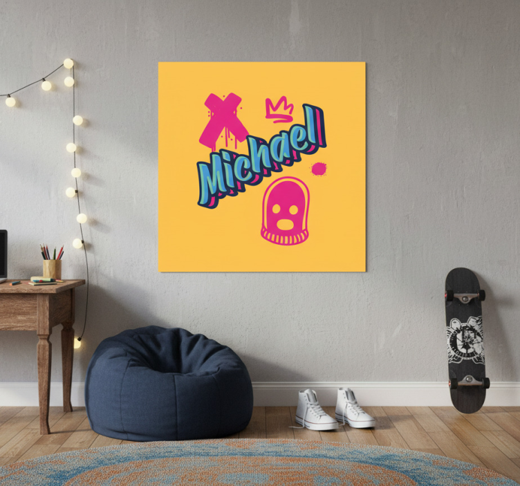 这幅生动的艺术作品展现了大胆的色彩和俏皮的元素。设计中以引人注目的蓝色字体呈现了名称'Michael',并融入了一个吸引眼球的粉色王冠和一个古怪的幽灵般的形象。背景是阳光明媚的黄色,这种构图唤起了创造力和充满活力的氛围,非常适合艺术空间。