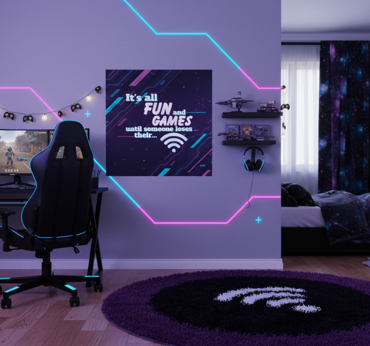 这个现代游戏房间拥有时尚的电脑设置,配备了符合人体工程学的椅子和鲜艳的霓虹装饰。一幅以幽默的Wi-Fi主题为灵感的趣味墙面艺术吸引了人们的注意。柔和的氛围通过一块豪华的地毯和星空窗帘得以提升,创造了一个邀请游戏爱好者的空间。