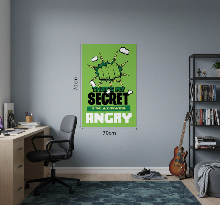 这张图片展示了一张生动的绿色海报,图中一个充满表现力的拳头突破了画面,伴随着爆炸般的图形。强调的文字是'That's my secret, I'm always angry',传达出一种既俏皮又强有力的情感。这种设计非常适合提升创意空间,展现幽默与活力的现代装饰风格。