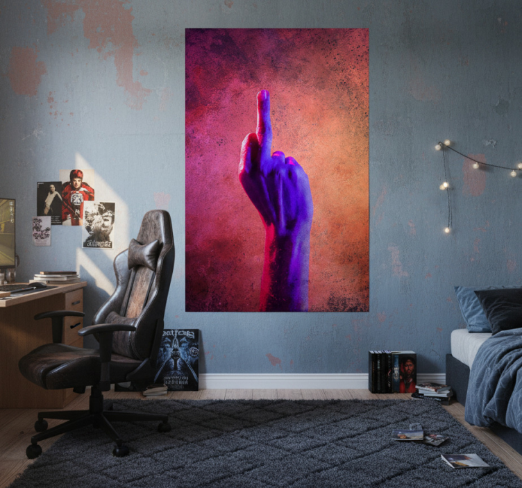 这幅图像展示了一只手高举,竖起中指,背景是紫色、粉色和橙色的纹理。这个大胆的手势传达了挑衅和态度,而戏剧性的光线强调了手指,形成了一个引人注目的焦点。