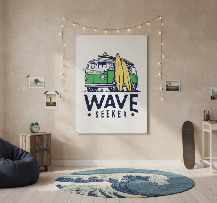 这幅生动的艺术作品展示了一辆俏皮的绿色面包车,车上放着冲浪板,体现了完美的无忧无虑的精神,适合海滩爱好者。短语 'WAVE SEEKER' 强调了对冲浪和冒险的热情。周围环绕着舒适的装饰元素,这件作品营造出一种轻松的氛围,非常适合任何冲浪爱好者的空间。