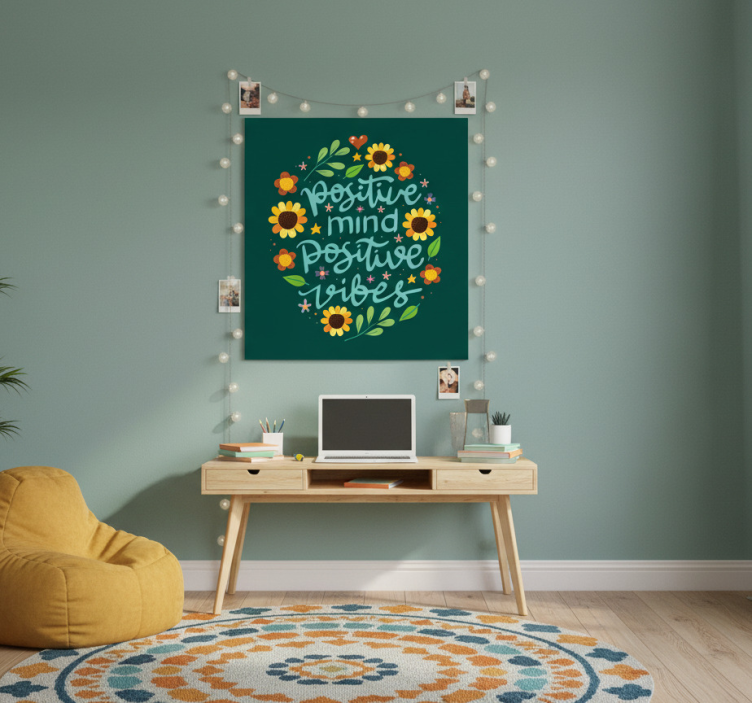 这幅图展示了一个时尚的工作空间,墙壁是舒缓的绿色。一幅装饰海报上写有激励人心的信息,周围环绕着生动的花朵和叶子。桌子上放着一台笔记本电脑、盆栽植物和文具,旁边是一块色彩丰富的地毯,增强了这个温馨的氛围。