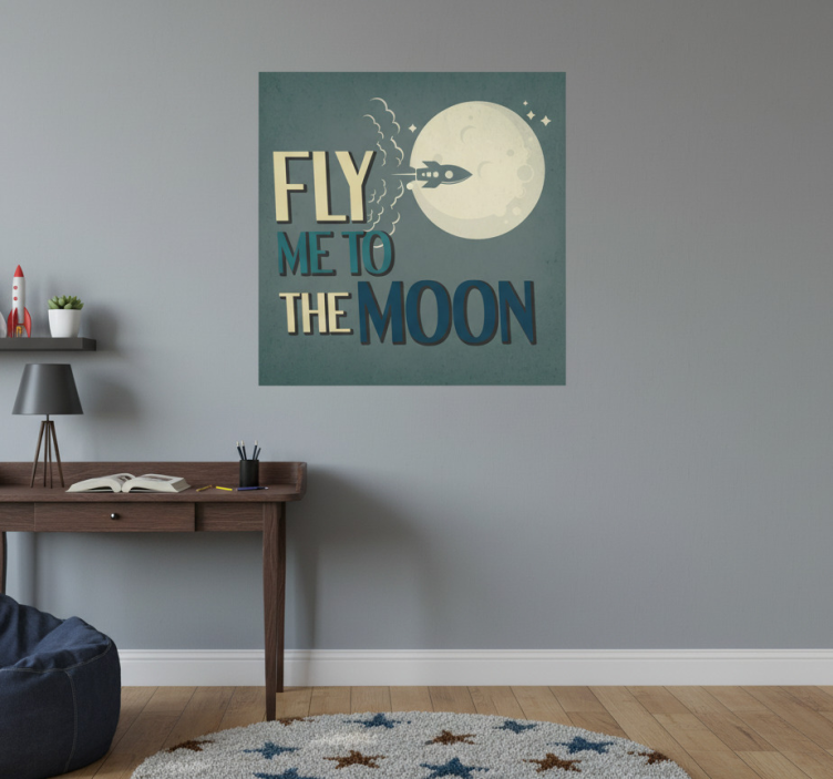 这幅图像展示了一个异想天开的设计,火箭正朝着一个风格化的月亮飞去。粗体字母以迷人的排列方式宣告着短语 'Fly me to the Moon'。色彩调色板包括蓝色和奶油色的阴影,营造出一种宁静、梦幻的氛围,完美激发探索和想象力。