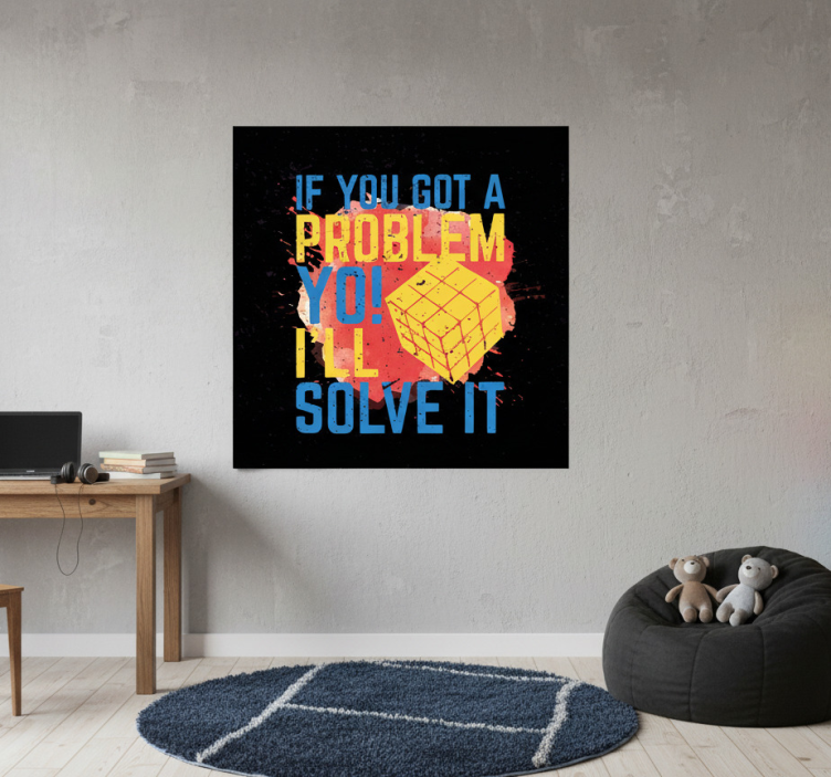 这幅生动的艺术作品展示了一句充满趣味和激励的名言,强调了解决问题的重要性。五彩斑斓的文字与黑色背景形成鲜明对比,点缀着红色和黄色的 splash。一个标志性的魔方象征着创造力和挑战,非常适合激励设计爱好者和问题解决者。