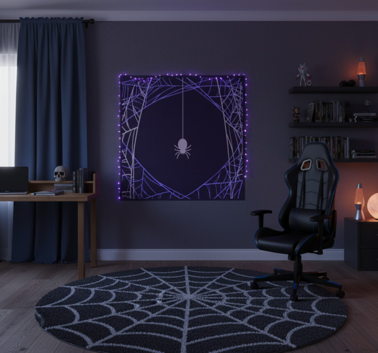 一个舒适的房间里,有一面深灰色的墙壁,上面装饰着蜘蛛网图案,与鲜艳的紫色背景形成对比。一盏天花板灯照亮了这个空间,突显出一把现代椅子和一张带有装饰骷髅的桌子。圆形地毯下的图案呼应了蜘蛛网的设计,营造出一种阴森却时尚的氛围。
