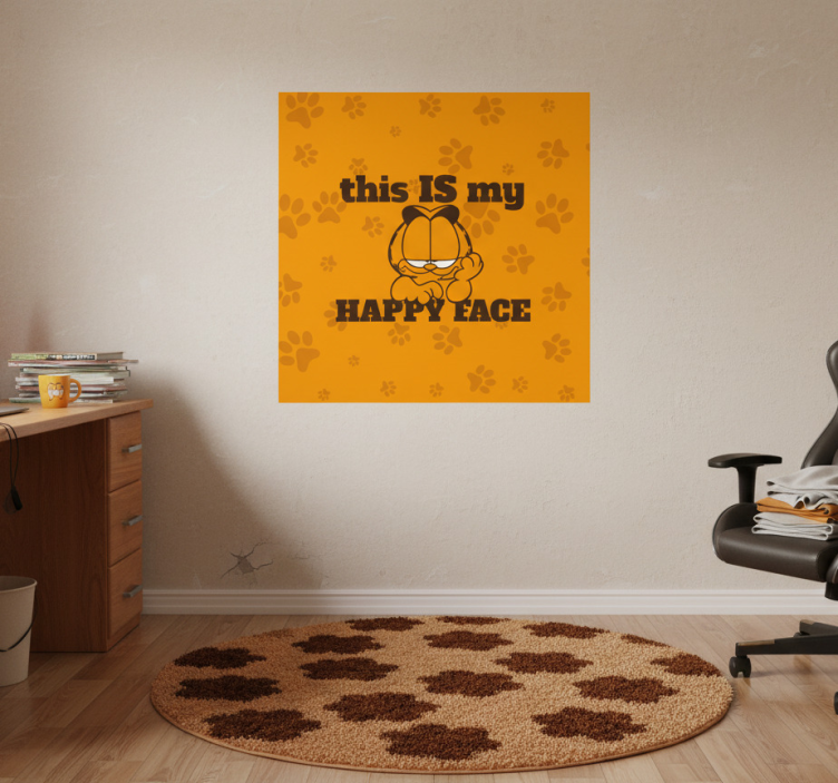 这幅生动的艺术作品展现了一只顽皮的猫咪角色,表达了满足感,背景是温暖的橙色,并点缀着爪印。短语 'this IS my HAPPY FACE' 强调了轻松愉快的主题。设计巧妙地结合了幽默和魅力,适合任何动物爱好者的装饰或个人空间。