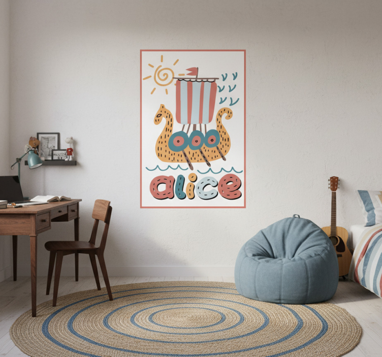 插图展示了一艘奇幻的船,形似维京长船,装饰着五彩斑斓的桨和帆。下面,名字'Alice'以俏皮的字母展示。明亮的太阳在上方照耀,搭配着 stylized 的波浪和鸟儿,营造出轻松愉快的想象场景。