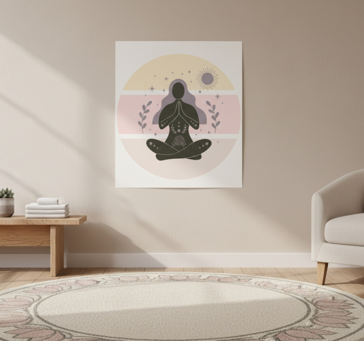这幅图像展示了一个冥想的人物,处于莲花坐姿,周围环绕着柔和的粉彩色调。星星、太阳和绿叶植物等元素营造出宁静的氛围。和谐的设计强调了宁静和正念,理想用于促进放松和灵性健康。非常适合装饰用途。