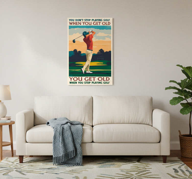 这幅图像展示了一位高尔夫球手在挥杆的瞬间,背景是一幅风景如画的高尔夫球场。短语强调通过高尔夫保持积极生活方式的重要性。柔和的色调营造出怀旧的感觉,而温馨的室内场景则为艺术作品增添了特色。对于体育爱好者来说,这幅印刷品为环境增添了个性。