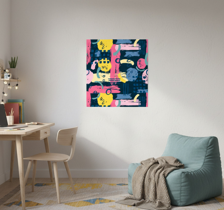 这幅充满活力的艺术作品展示了一组玩味十足的抽象形状和色彩,鲜艳的黄色、粉色和蓝色在深色背景上相互交融。通过动态的圆形、线条和笔触的排列,这件作品散发出创造力,成为当代室内设计中引人注目的补充。