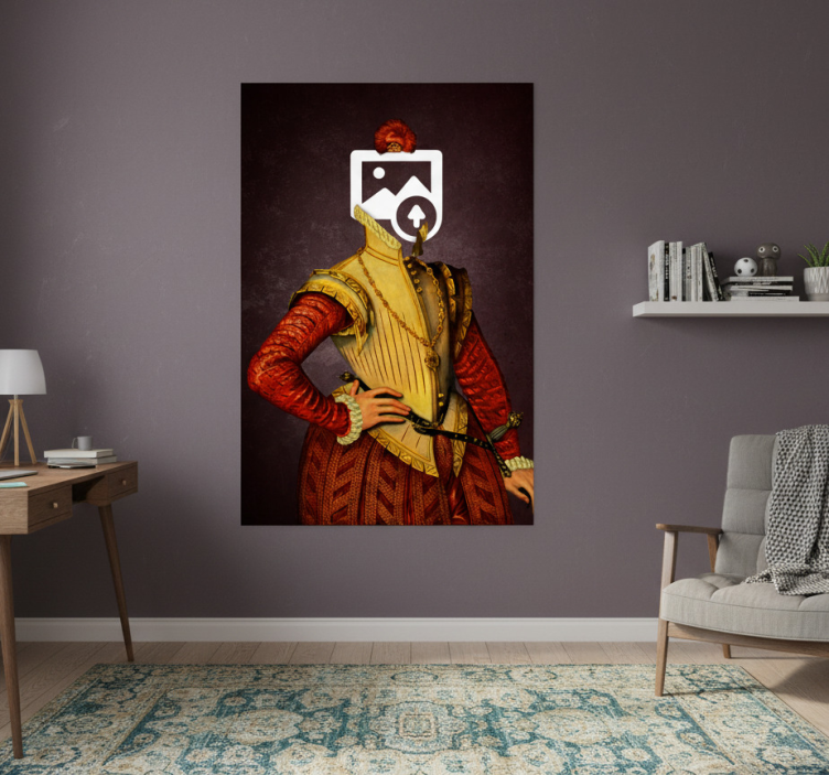 这幅图像展示了一位引人注目的历史人物,身穿华丽的红色服装,布料上展现出复杂的设计。服装配以一条装饰性的项链和独特的领口。周围的元素散发出优雅,强调了人物的突出姿态,而深色的背景则为整体构图增添了深度。